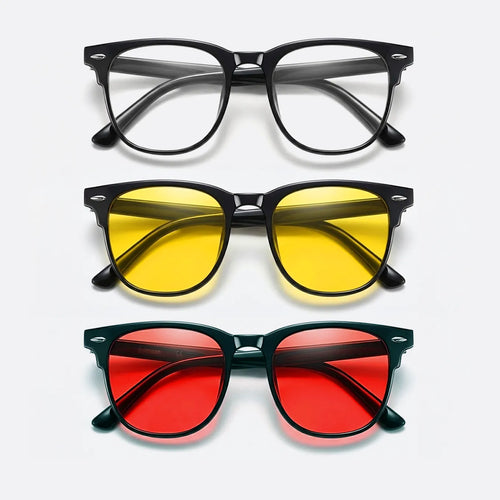 Incluye tres gafas con lentes de colores amarillo, rojo y transparente, diseñadas para adaptarse a diversas necesidades visuales, desde gaming hasta lectura prolongada.